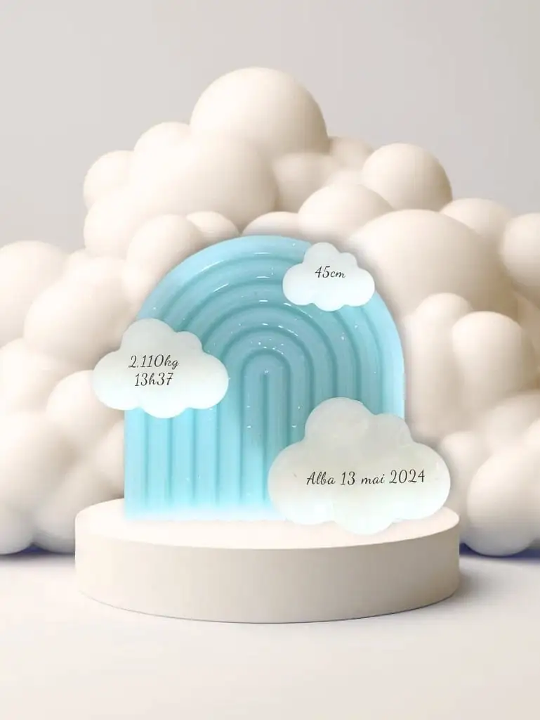 Gravé avec soin, cet arc-en-ciel présente les détails de naissance de ton bébé arc-en-ciel, y compris son nom, son poids de naissance, sa taille et son heure d’arrivée dans ce monde merveilleux. Chaque détail est méticuleusement intégré à l’arc-en-ciel, ajoutant une touche personnalisée à cette pièce unique.