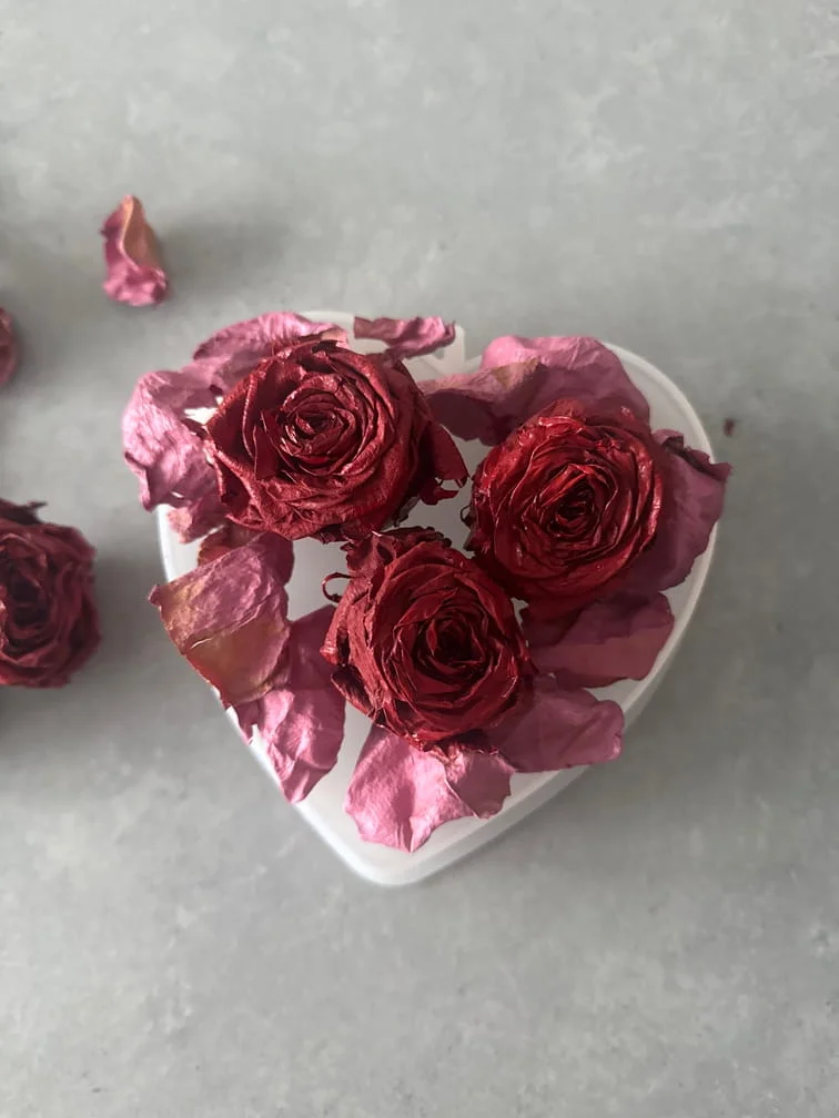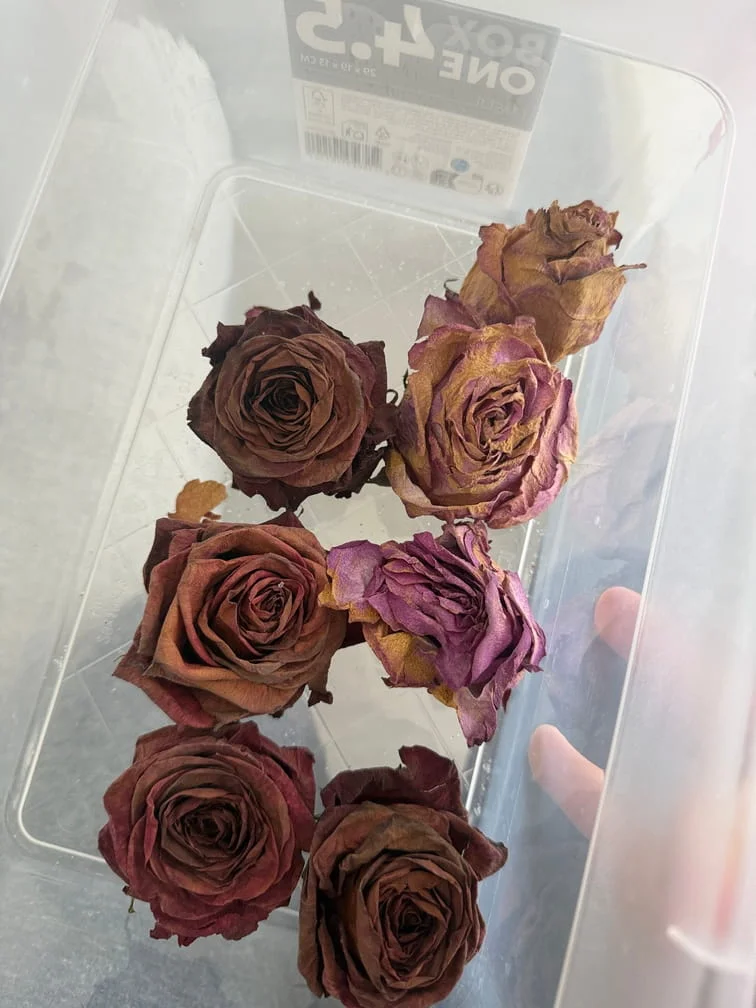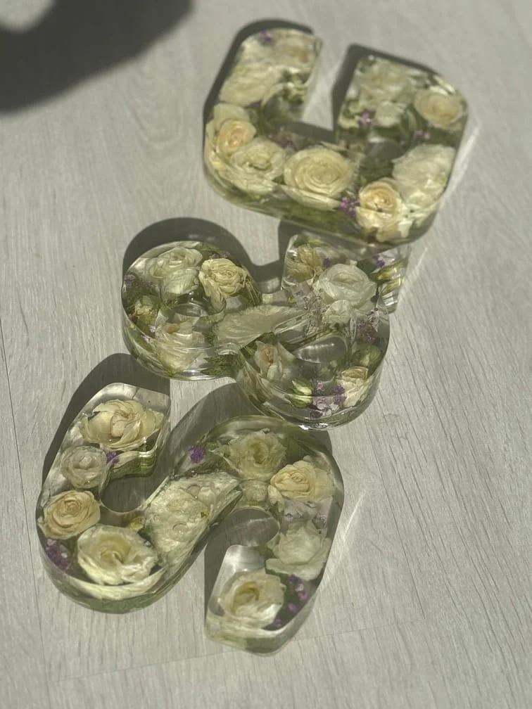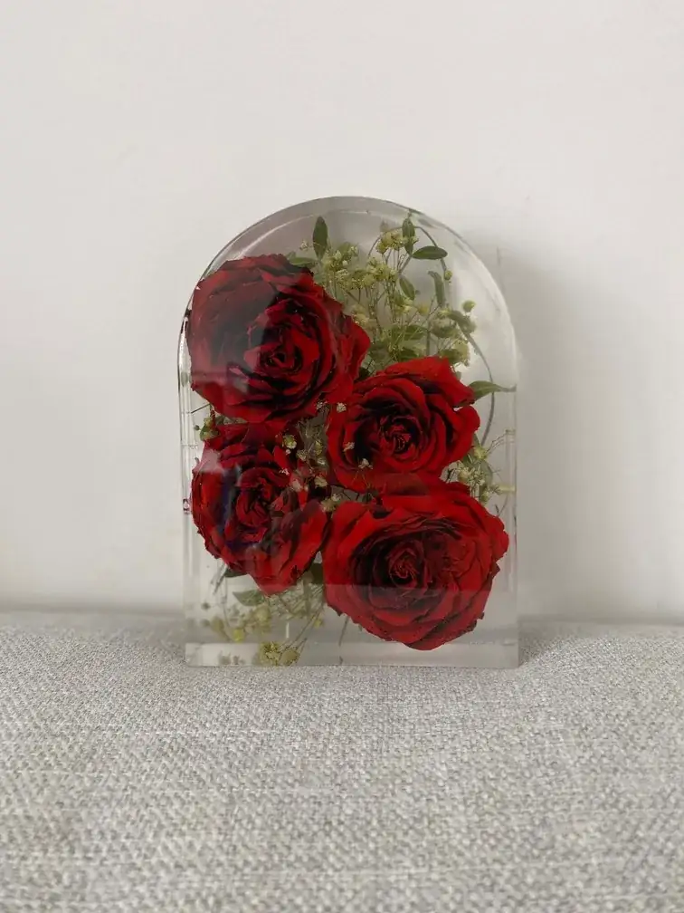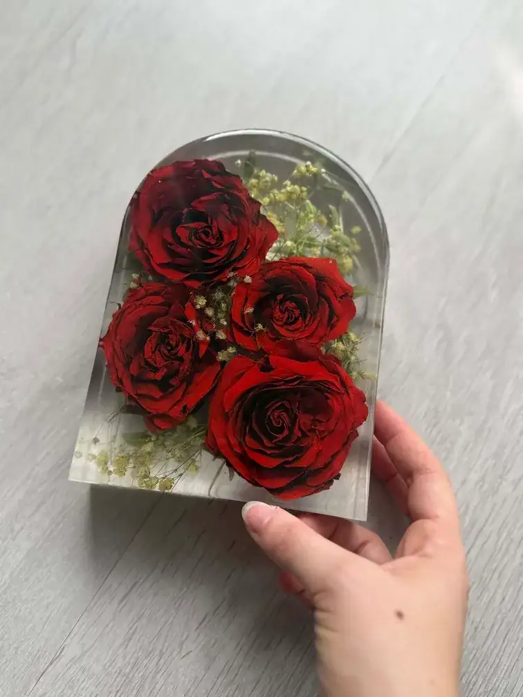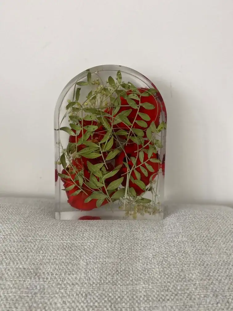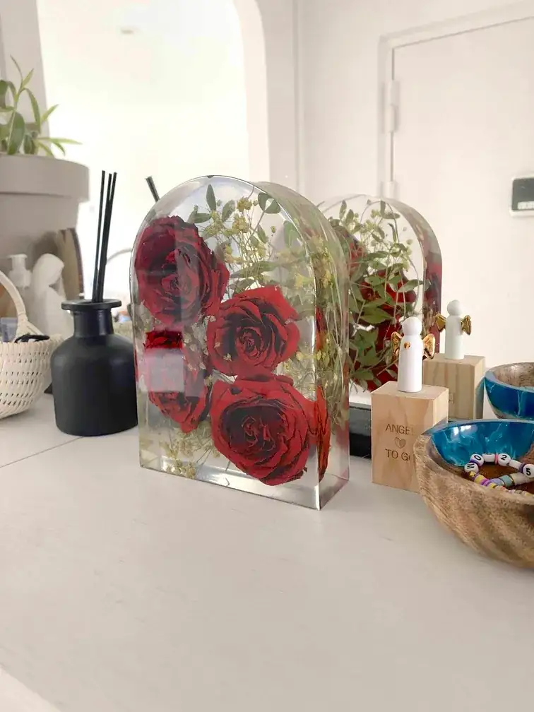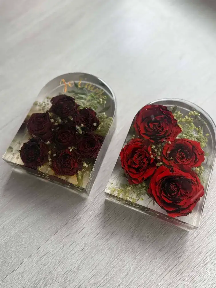 Le processus est entièrement artisanal et réalisé avec la plus grande délicatesse. Après réception de ton précieux bouquet (ou celui de ton PACS), je procède moi-même à un séchage minutieux des fleurs pour préserver au mieux leurs couleurs et leurs formes. Ensuite, je les incorpore dans une résine transparente de haute qualité pour créer un bloc de souvenir durable.