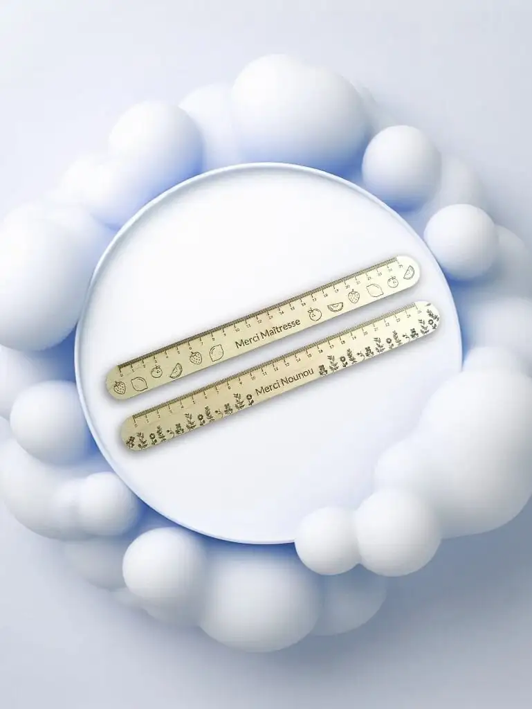 Offre une règle personnalisée de 25cm avec illustrations et gravure (« Merci ATSEM », « Année 2024/2025 » ou autre). Le cadeau ATSEM/maître… idéal pour remercier l’équipe scolaire en fin d’année !