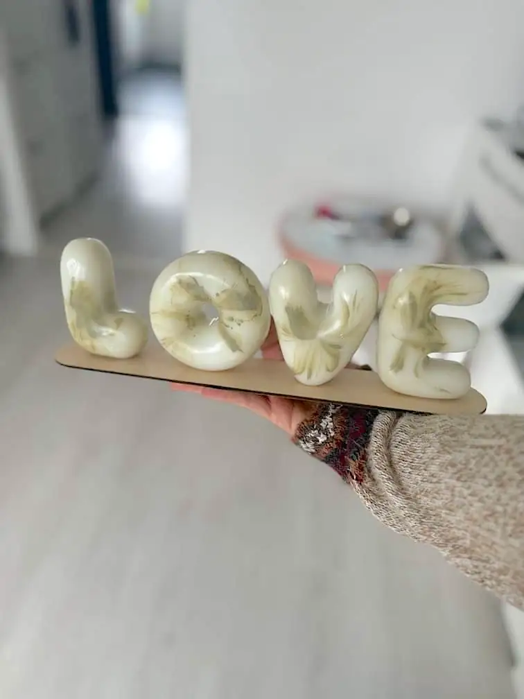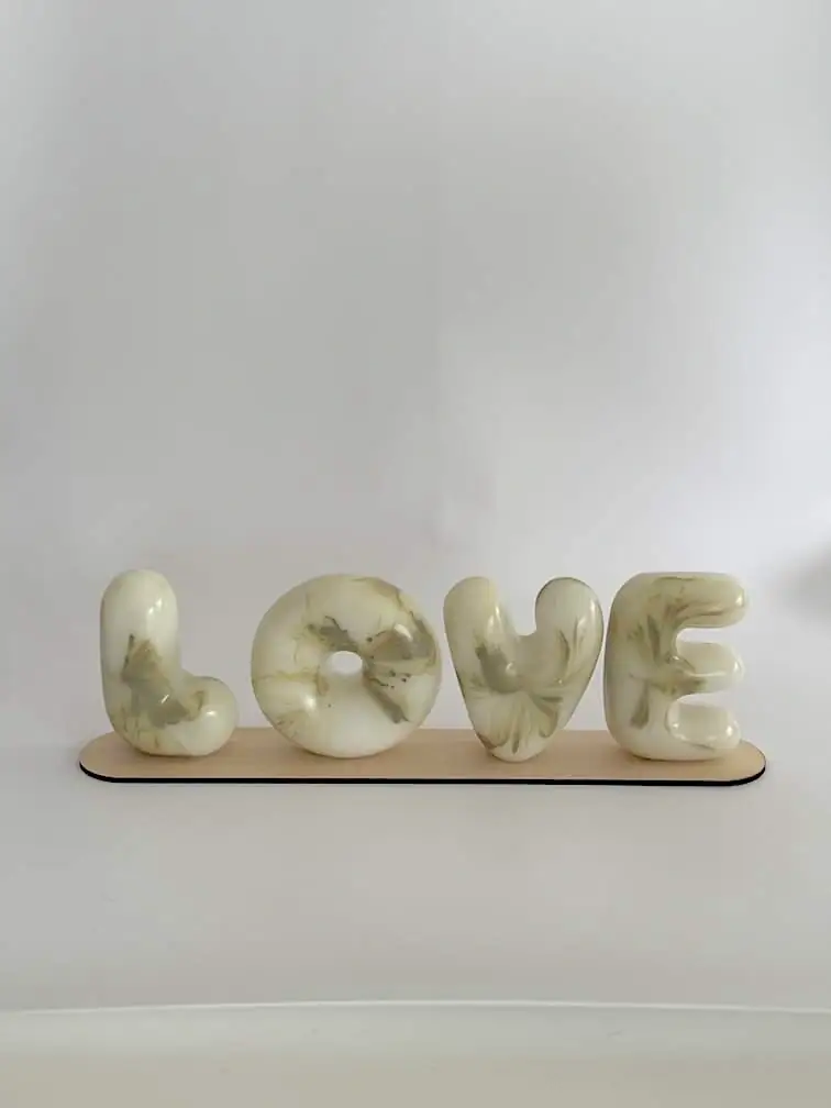 La résine apporte une touche moderne, design et lumineuse, tandis que le support en bois réchauffe l’ensemble, créant un équilibre parfait entre design et émotion. Ce LOVE devient alors bien plus qu’un objet décoratif : il raconte votre histoire, il ancre vos souvenirs, il symbolise ce lien unique qui vous unit.