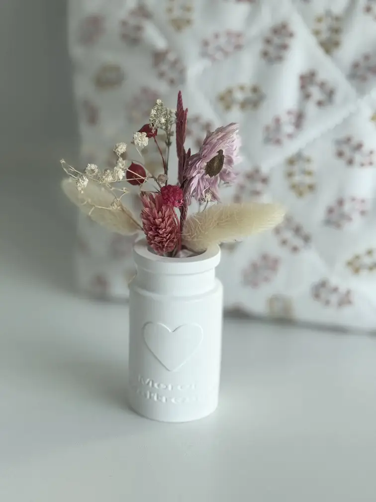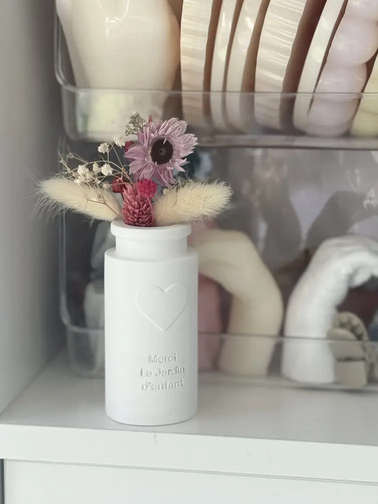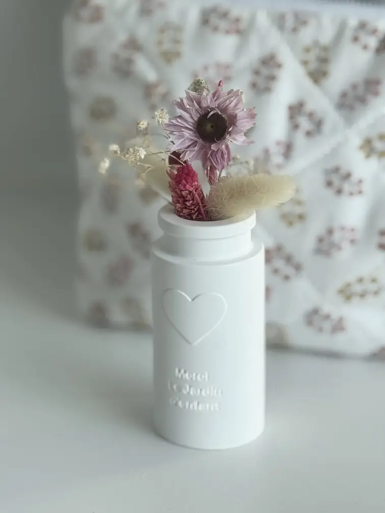 De plus, ce petit vase, au design épuré, est orné d’un cœur en relief, symbole de l’amour et du dévouement. Accompagné d’un charmant mini-bouquet de fleurs séchées, il ajoute une touche de nature et de poésie. C’est le cadeau idéal pour une maîtresse, une ATSEM, une nounou, ou tout autre professionnel de la petite enfance qui a marqué l’année de ton enfant.
