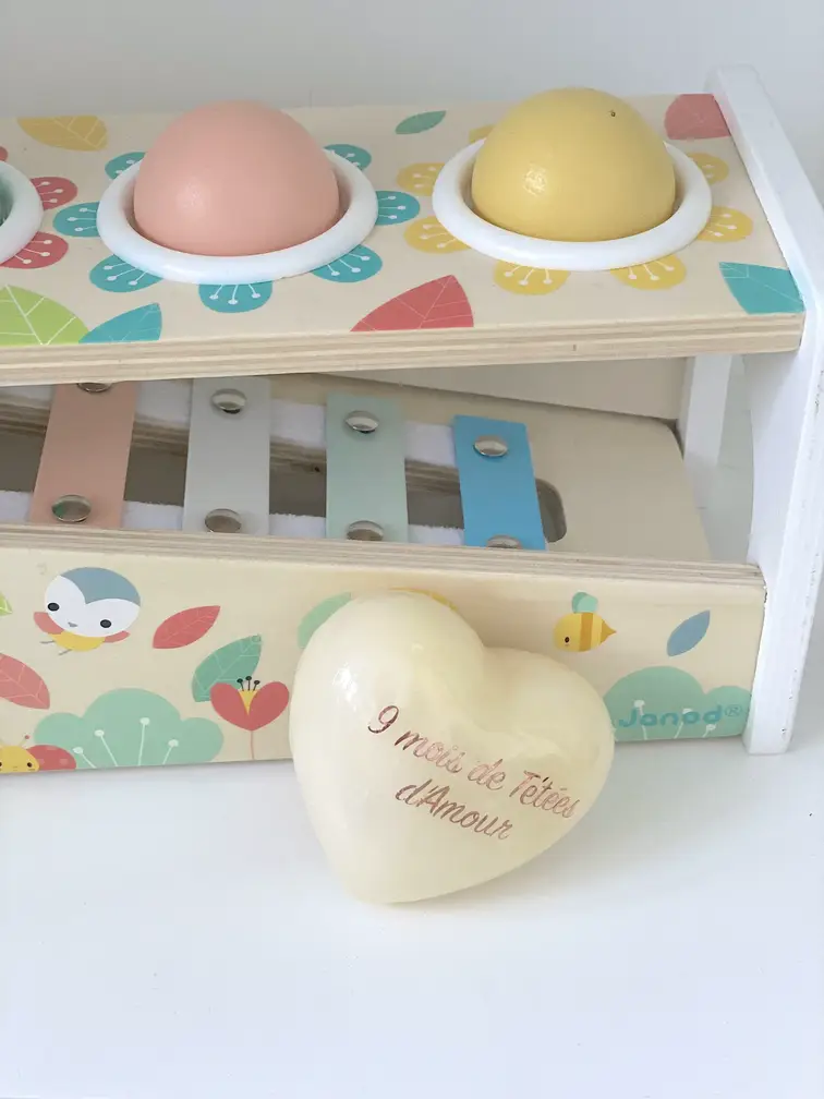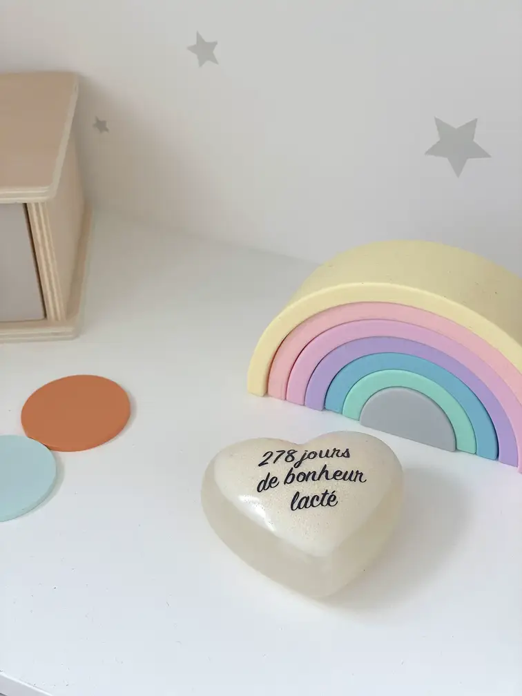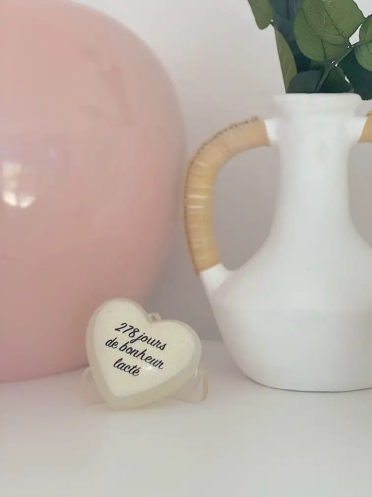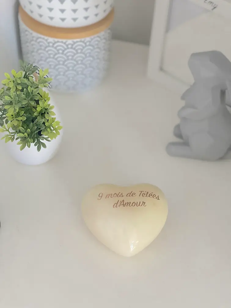 De même, ce cœur, symbole d’une tendresse infinie, s’offre à la personnalisation. Chaque mot gravé évoquant l’essence même de la maternité, de l’allaitement, de ces instants fugaces mais éternels. Où le temps se suspend pour laisser place à la fusion des âmes.