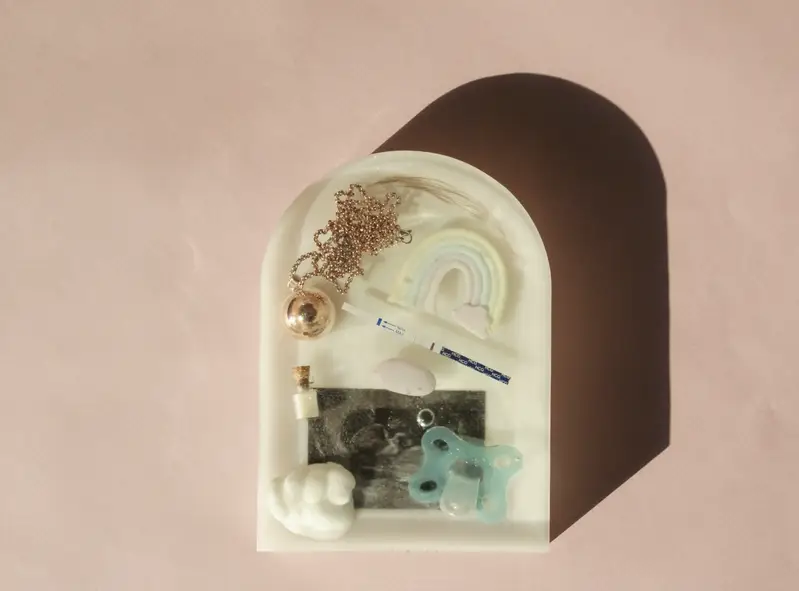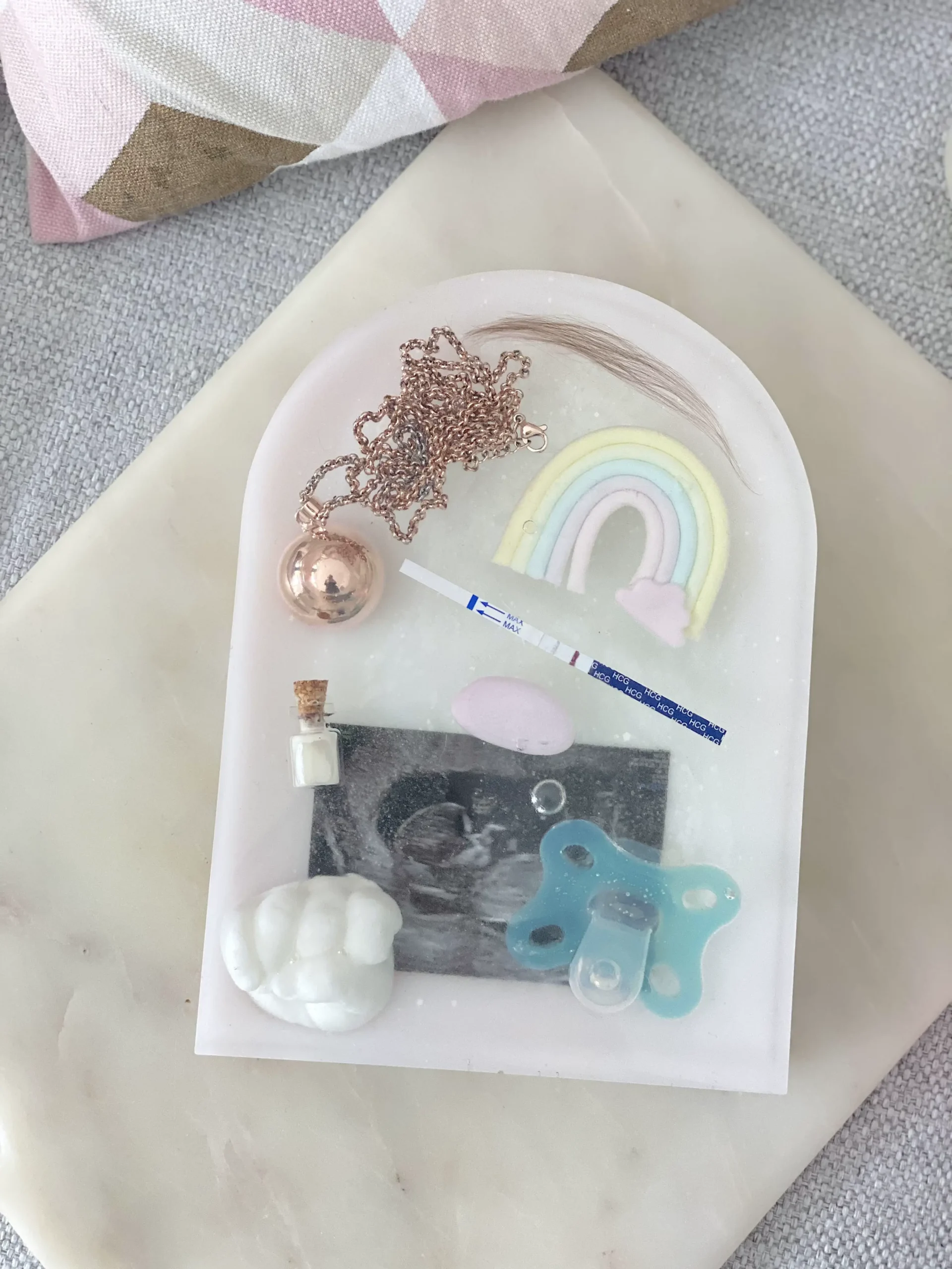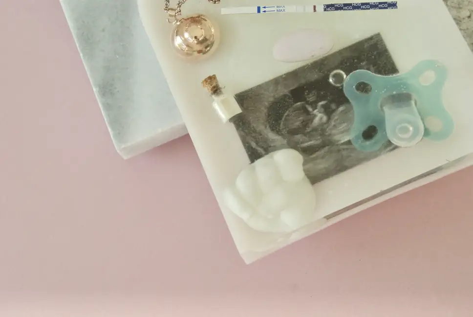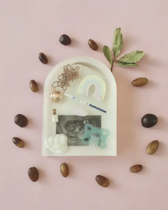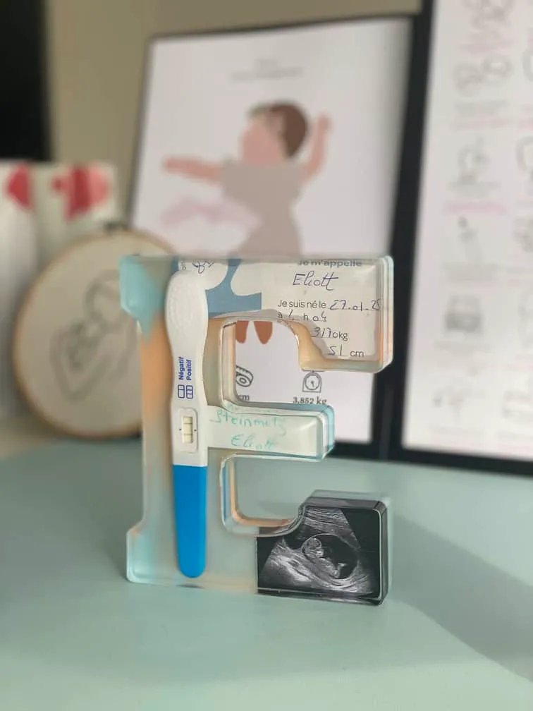 Crée une décoration en arche ou initiale personnalisée en résine avec tes souvenirs de naissance : tétine, échographie, prénom… Un cadeau unique et émouvant.